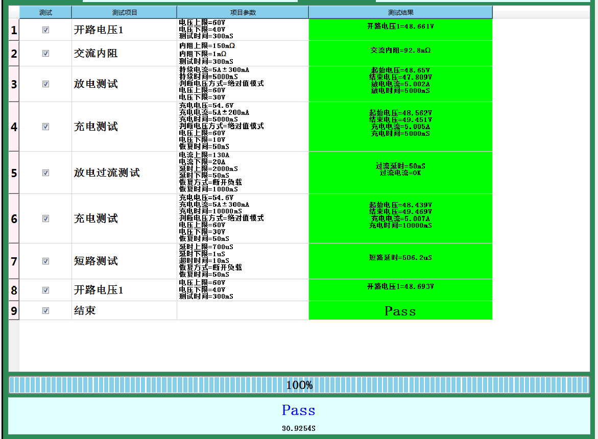 成品電池綜合測試設備是一款快速準確測試成品電池性能的設備,主要測試項目有:開路電壓、交流內阻、放電測試、放電過流測試、短路保護測試、充電測試、充電保護測試。系統采用 32 位 ARM 處理器,電壓、電流采用 16 位 AD 轉換器,相比同類設備測試速度快、測試精度高、支持多臺設備同時操作。廣泛用于汽車電子、航空航天、船舶、太陽能儲能、電動自行車、電動摩托、后備電源電池、通信電源等動力電池組生產和科研實驗測試。